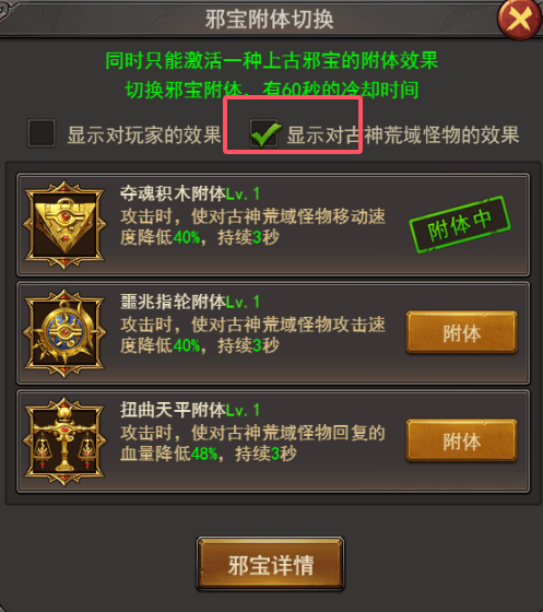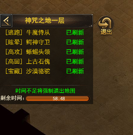 进入地图可通过自行操作行走和使用随机石,推荐优先快速找寻左边的几个大怪进行击杀,对应怪物会有不同的效果,可以根据描述的名字观察,其中宝藏和回血比较难,推荐可以找寻队友一起打。回血等若有提升荒域主城内——古神邪宝,将在左下角出现一个附体技能,可以根据对应的怪,附体使用相应技能克制。