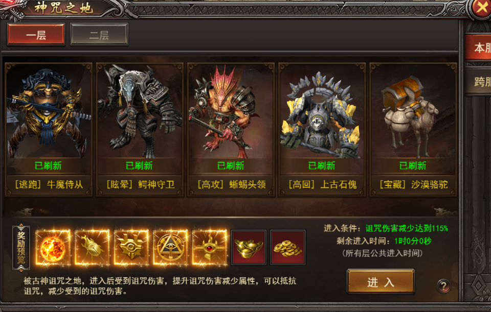 进入条件不同层数、本服跨服有所不同,详情可以关注页面描述,诅咒伤害减少这个值主要通过提升伏羲装备和本地图的神咒装备获取。
