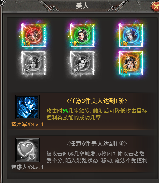 1.套装技能1--坚定军心:攻击时有几率触发,触发后可降低攻击目标控制类技能的成功几率,神将等级越高,技能触发几率越高 ;
