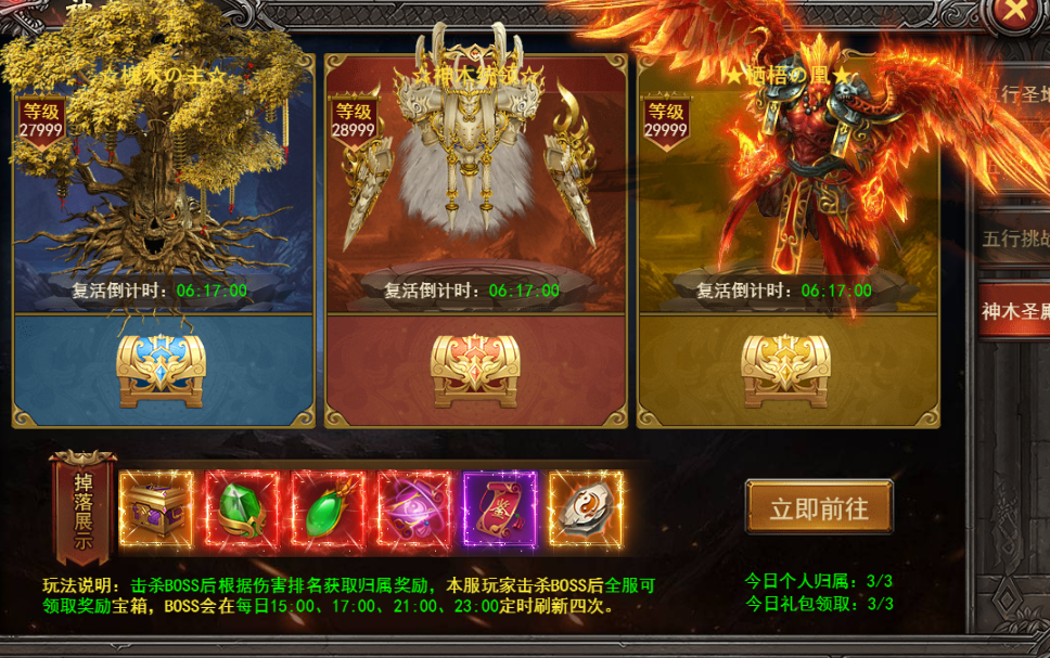 若实力足够,优先推荐打右下角29999级怪物,获取奖励更多哟~怪物为个人归属,会根据打怪的伤害排名计算归属奖励;本服的玩家击杀后可以在主界面点击领取宝箱,BOSS将在每天15:00、17:00、21:00、23:00刷新重置,对应时间有空闲可以参与击杀下~可获取提升五行木属性装备等道具,让各位道友实力大涨!