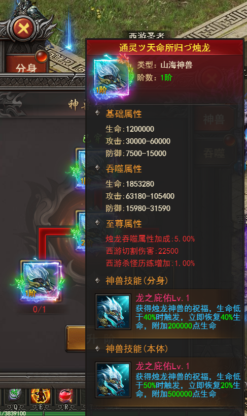 2. 激活山海神兽烛龙之后可以获取神兽技能(分身)龙之庇佑、获得烛龙神兽的祝福、生命低于40%时触发、立即恢复40%的生命,附加20W点生命。