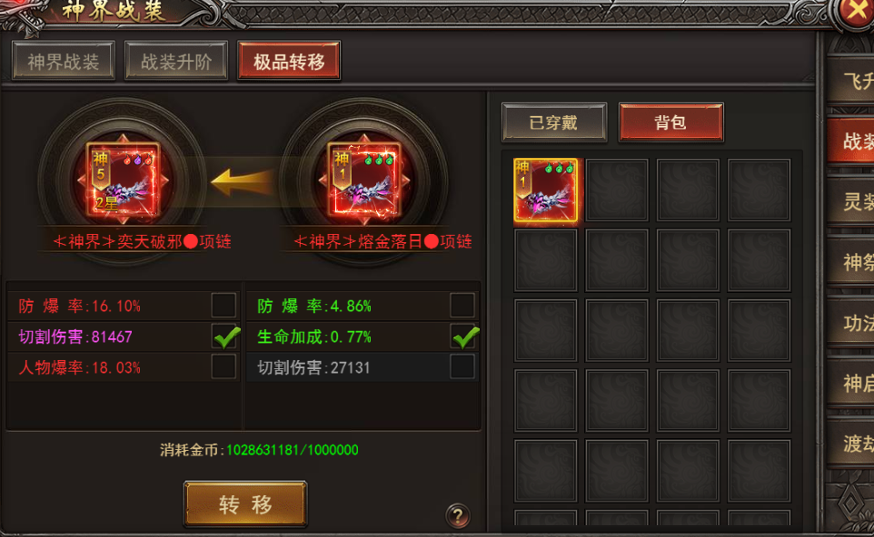 右边还有一个极品转移按钮,就是本期重点,属性转移。打开后可先点击身上的装备,然后背包内有其他低等级极品属性装备,可以选择对应极品属性替换到穿戴装备上;转移后被转移的装备会消失,请注意合理选择转移属性哦~