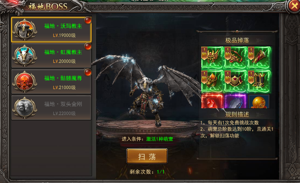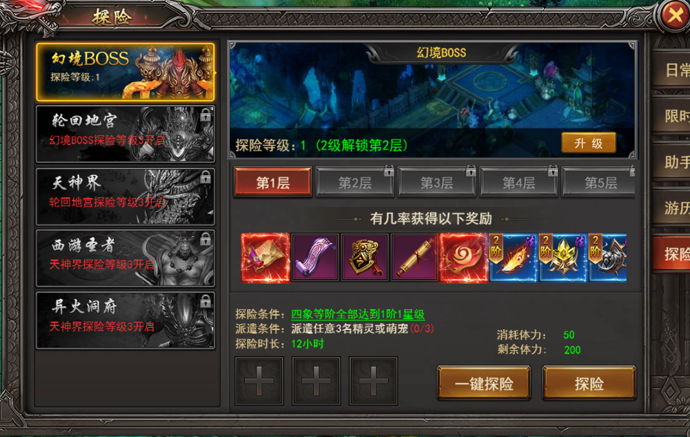 BOSS:共有4个BOSS,满足对应条件可解锁,每天会赠送一次免费次数,通关一次后续就可直接每天扫荡。