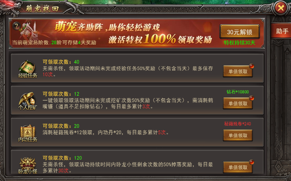 找回(系统开启后15天开启):开启特权可以用于找回上一天未做的任务(可累积多天,左上角会有描述),具体详情可以以页面情况为准。