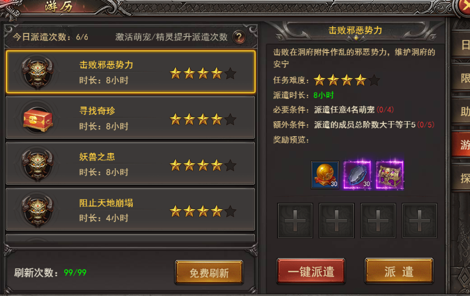 游历:可通过选择背包内有的宠物进行派遣前往探险获取奖励,可参照对应必要条件和额外条件进行派遣。(一般一键派遣也会出战最好的)