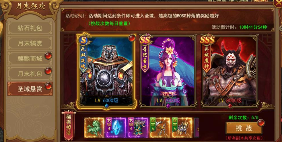 3.三个级别的BOSS都可以掉落麒麟玉,可以在麒麟商城进行兑换高阶道具,每天挑战次数上限五次。