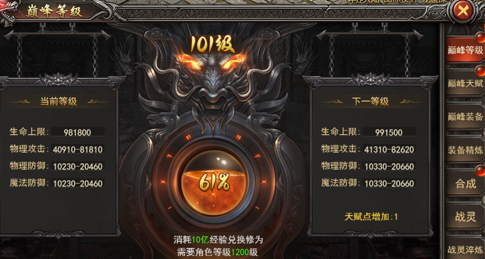 4.巅峰等级升级后,增加任务属性与天赋点。