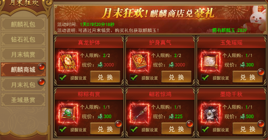 3.三个级别的BOSS都可以掉落麒麟玉,可以在麒麟商城进行兑换高阶道具,每天挑战次数上限五次。