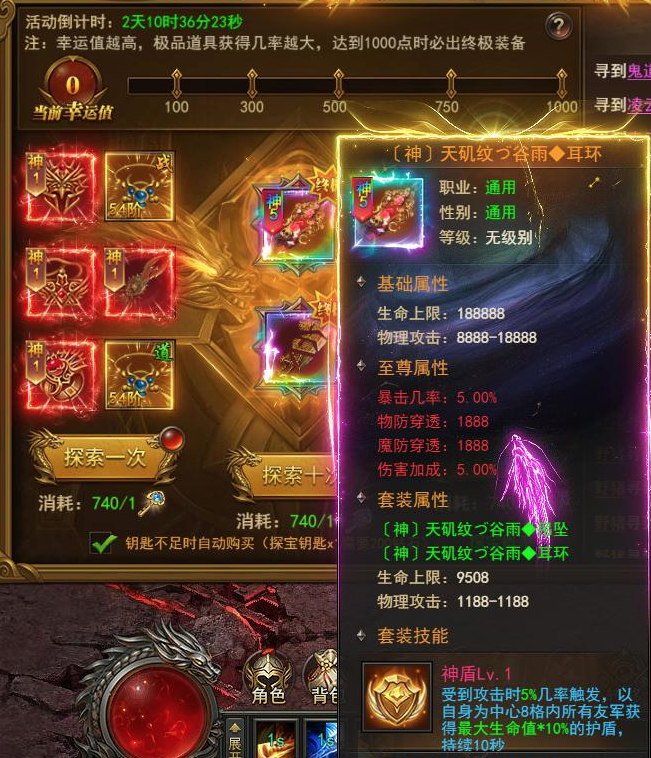 2.激活之后可以增加至尊属性暴击记录、物防穿透、魔防穿透、伤害加成等等,另外激活神装吊坠的话,可以拥有套装属性。