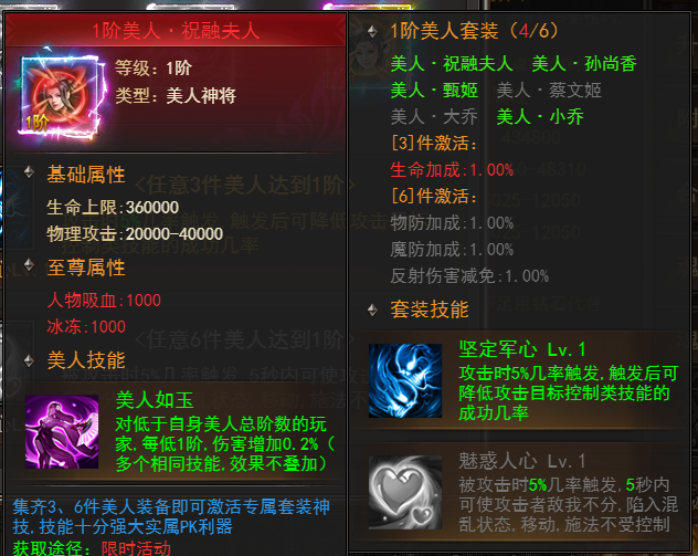 被动技能--美人如玉:对低于自身美人总阶数的玩家,每低1阶,伤害增加0.2%