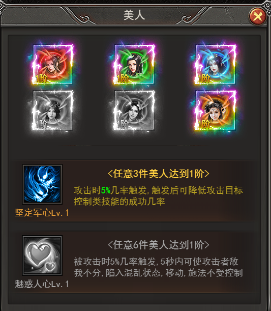 套装技能2--魅惑人心:被攻击时,有几率触发,5秒内可使被攻击者敌我不分,陷入混乱状态,移动、施法不受控制,神将等级越高,技能触发几率越高;