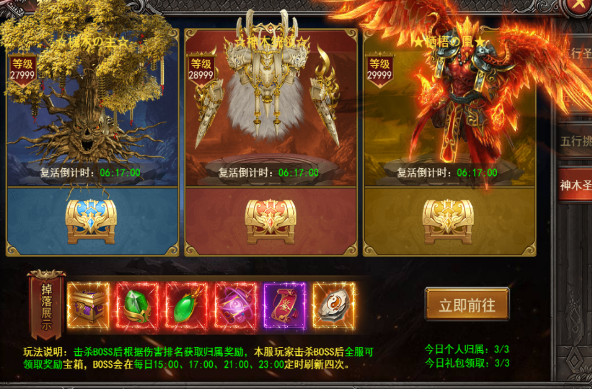 若实力足够,优先推荐打右下角29999级怪物,获取奖励更多哟~怪物为个人归属,会根据打怪的伤害排名计算归属奖励;本服的玩家击杀后可以在主界面点击领取宝箱,BOSS将在每天15:00、17:00、21:00、23:00刷新重置,对应时间有空闲可以参与击杀下~可获取提升五行木属性装备等道具,让各位道友实力大涨!