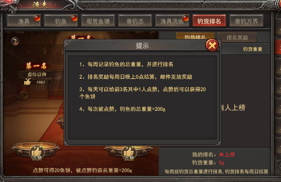 钓货排名:根据个人钓上来的鱼的重量,可以增加自己的排名数值,每周一到每周日晚上0点。还可以给排行前三的玩家进行点赞,点赞可以获取到鱼饼,被点赞玩家还可增加钓鱼总重量数值。