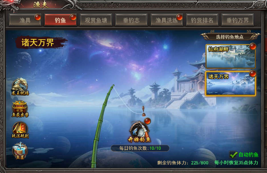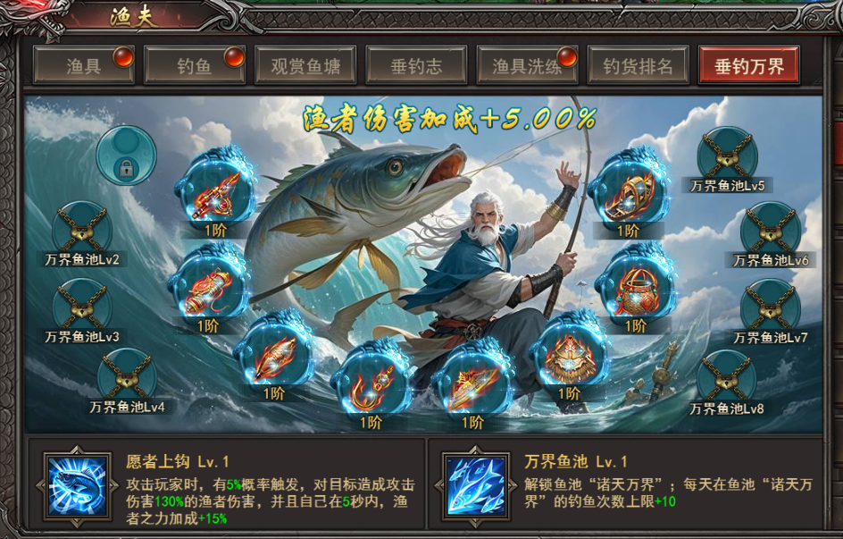 垂钓万界:为渔夫玩法的装备,需要关注不定期运营活动等进行获取装备,获取一套后可开启钓鱼页面诸天万界的钓鱼地点,能获取更多属性高的鱼获,增加自身属性,可根据需求考虑获取哦~