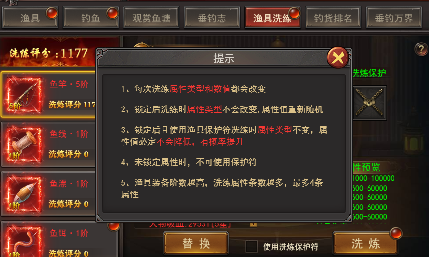 渔具洗练也可进行洗练提升属性,推荐多洗渔者之力这个属性,其他的可以选择pvp切割、攻击、生命等,可根据自身需求搭配。