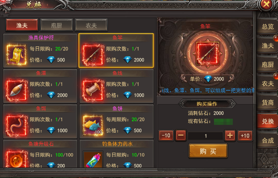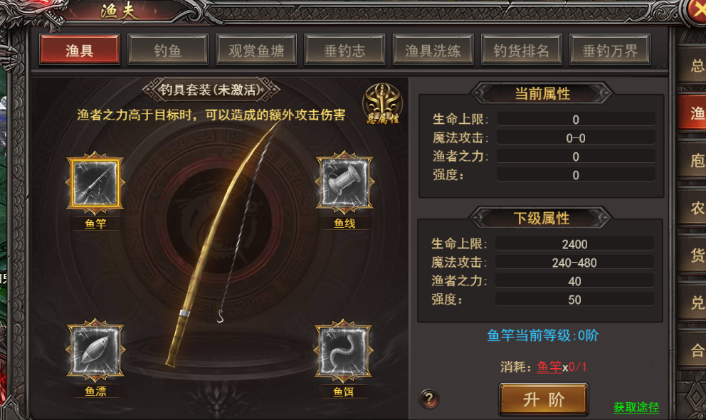 首先渔夫玩法可以先在对应玩法页面的兑换按钮内,先获取4个主要的装备,鱼竿、鱼线、鱼漂、鱼饵。