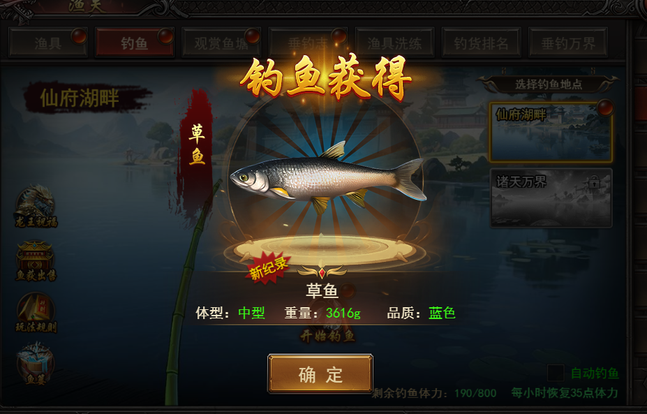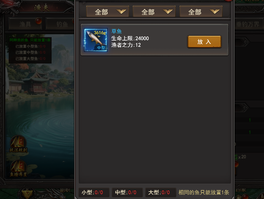 然后我们可以先开始在钓鱼界面花费体力钓鱼,钓到的鱼可以放入观赏鱼塘进行提升自身属性(会有放入限制,可提升鱼塘等级增加放入上限)。