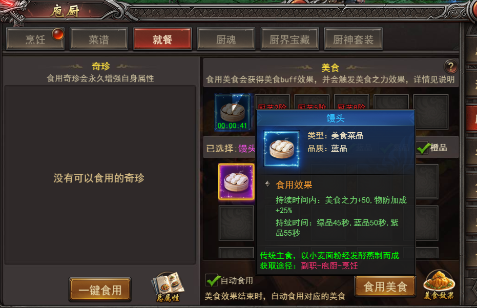就餐页面可以进行食用自己烹饪的美食,每个美食会有不同的效果,可以根据需求进行食用。