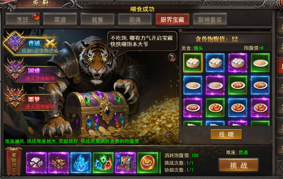 3、挑战需要消耗饱腹值,喂食美食会增加饱腹值。