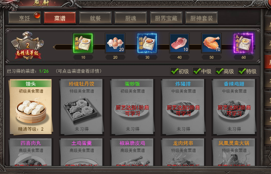 在菜谱页面学习获得的食谱后,可以在烹饪页面花费材料开始烹饪美味佳肴(会有概率失败,失败会获取厨艺币,可在兑换页面兑换材料道具)。高级的菜谱需要一定庖厨等级才能学习,等级可以通过不断烹饪菜肴进行提升~
