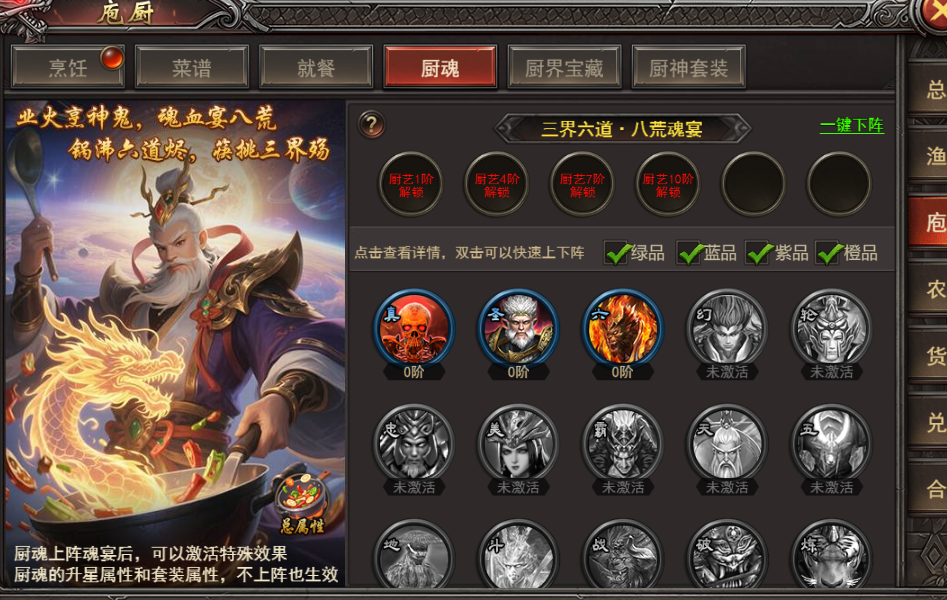 厨魂:初始将会有三个基础厨魂,在厨艺1阶等之后还可进行上阵,增加自身属性(上阵也有套装属性,可以点开某个厨魂看右上方的套装要求)。