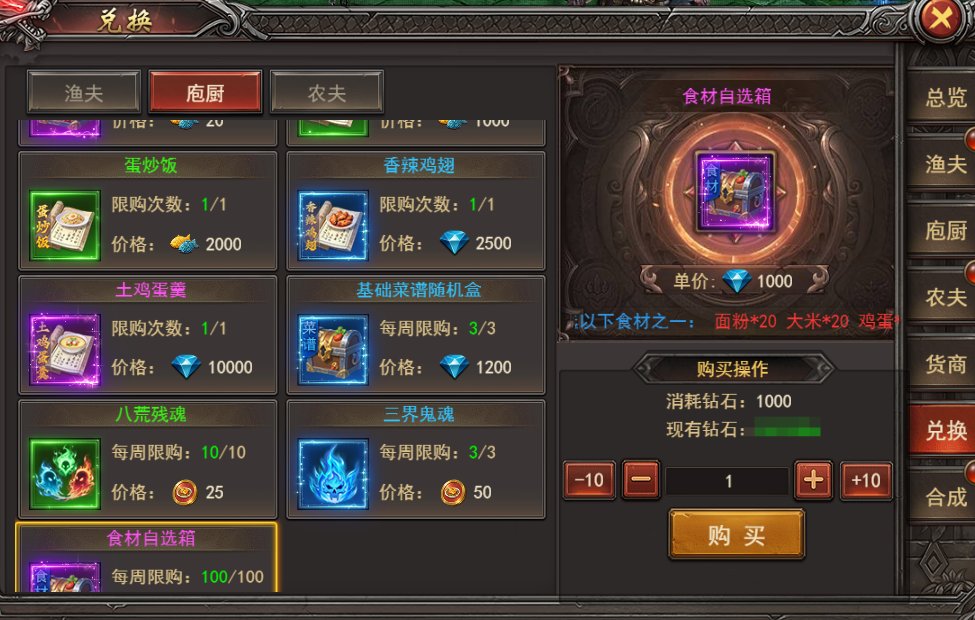 首先可以在副职——兑换,庖厨分页按钮内先获取基础食谱、食材,可花费钻石或者鱼饼(鱼饼可通过渔夫玩法获取,详情可以关注上期攻略)